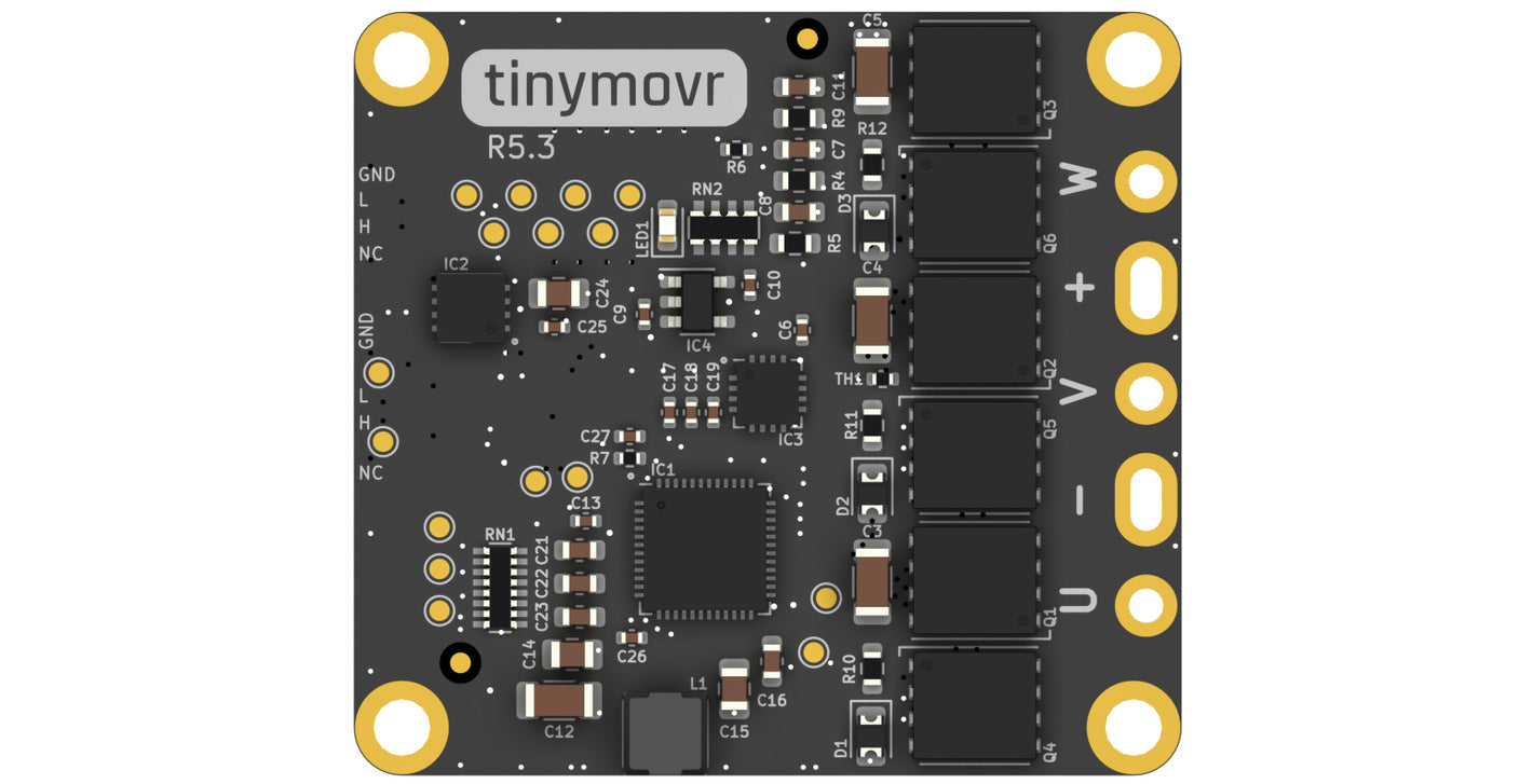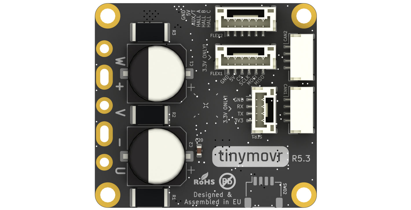 Tinymovr R5.3 is a compact and powerful brushless motor controller with integrated absolute angle sensor. Featuring a 32-bit ARM Cortex M4F (Qorvo PAC5527), an absolute magnetic angle sensor, and 25A maximum continuous phase current, it offers precision operation in position, velocity and torque modes using Field Oriented Control (FOC). It supports CAN, UART and Hall sensor connectivity. Its compact size allows for seamless integration at the back of the brushless motor.